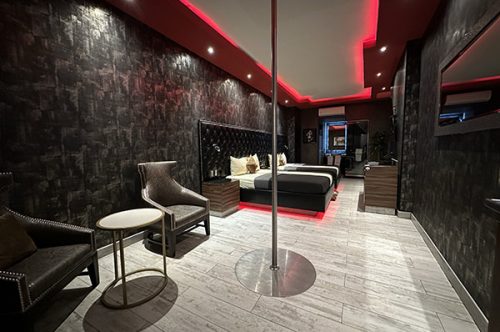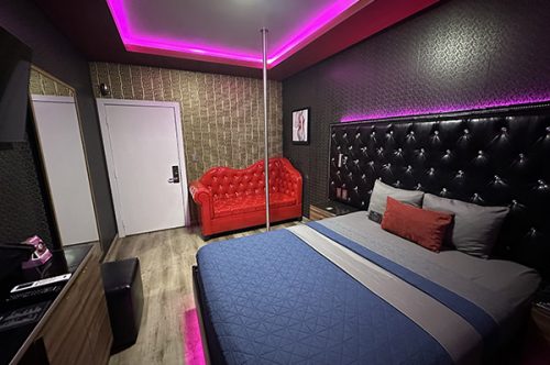 Relajante Habitación con Jacuzzi Grande, Sofá Kama Sutra, Cama Tamaño Rey, y más…